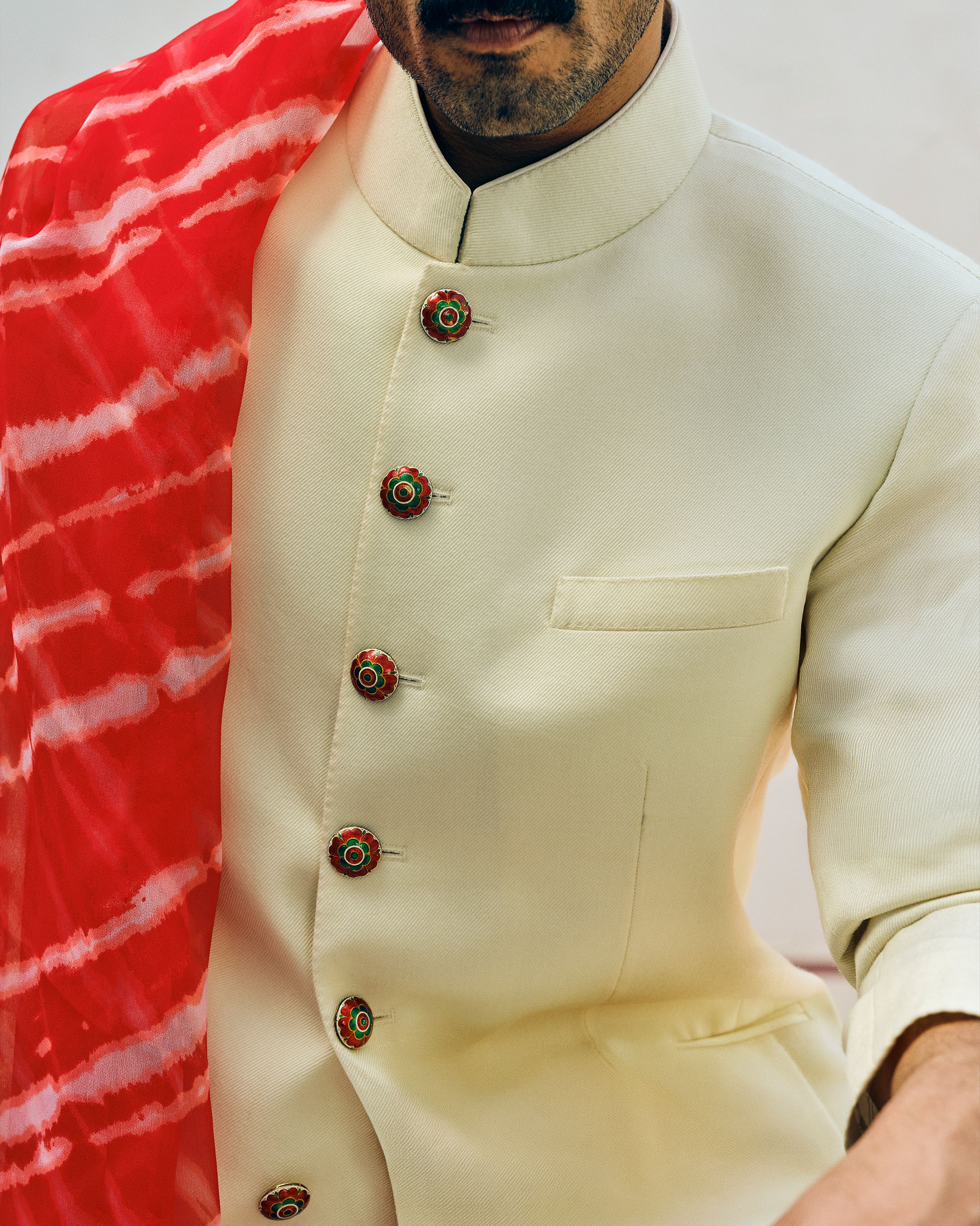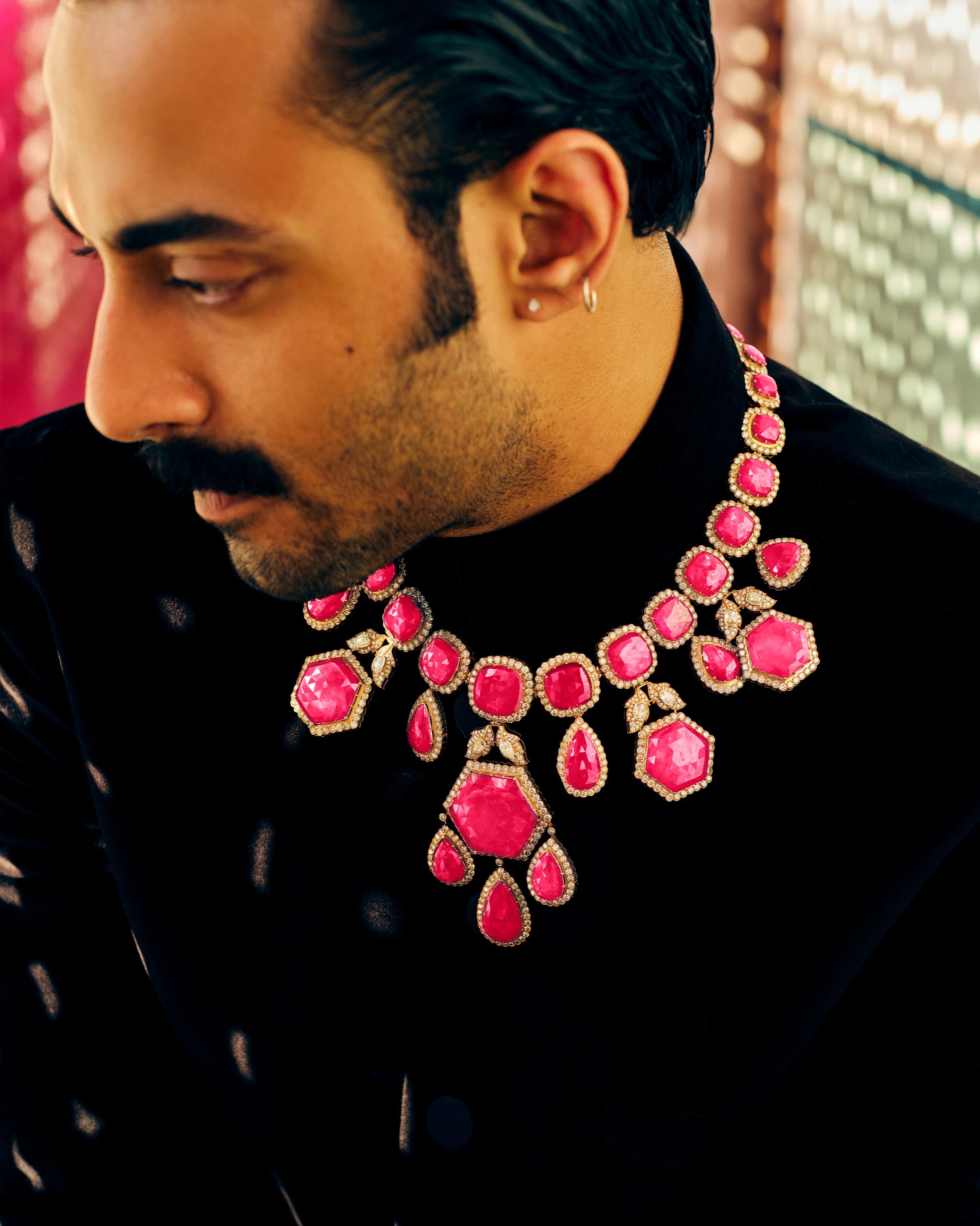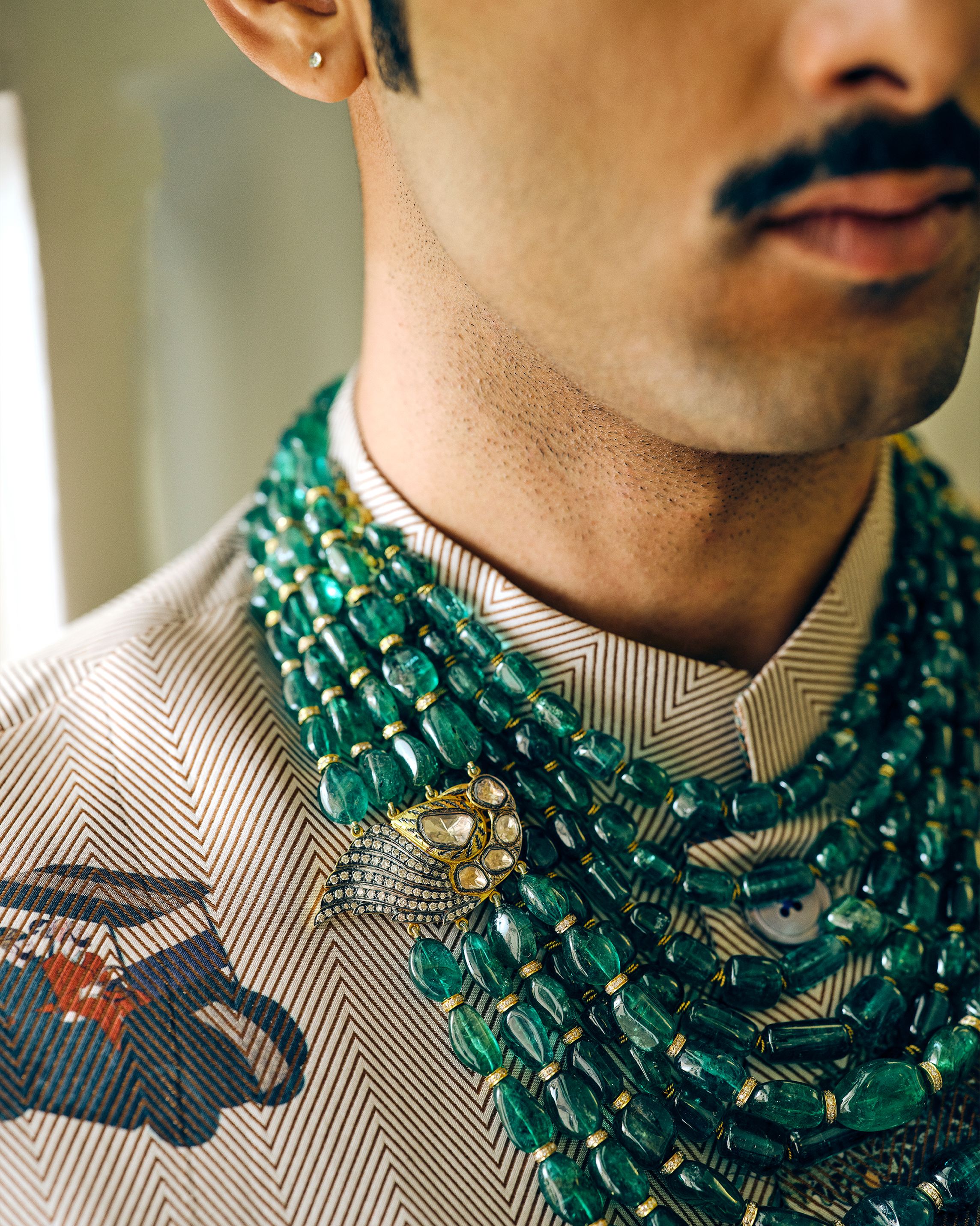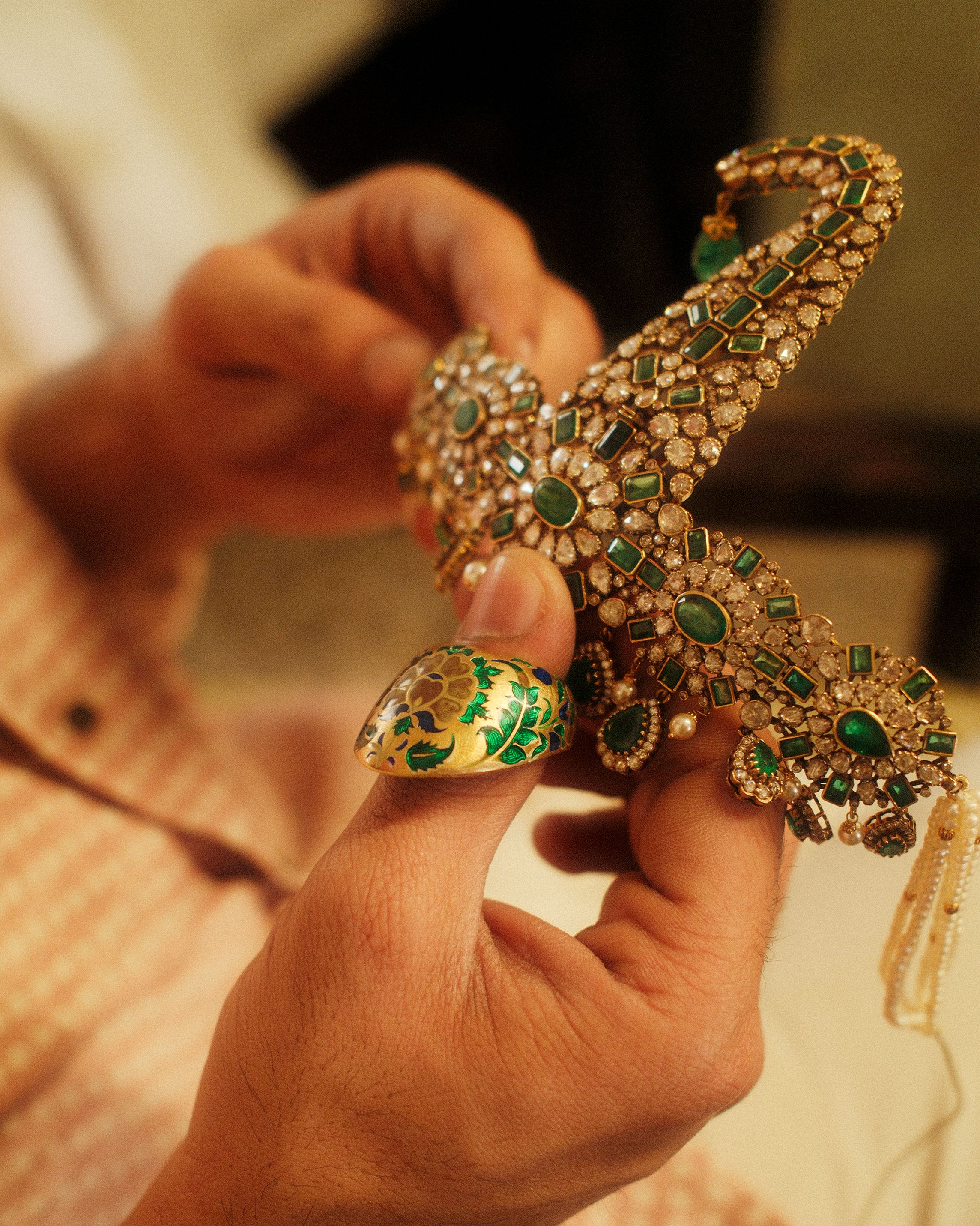 The collection draws inspiration from the world around us, celebrating the beauty and symbolism of nature. Iconic motifs such as the peacock, a symbol of royalty, and the falcon, representing leadership, are intricately woven into designs that are as meaningful as they are stunning. From brooches shaped like majestic birds to buttons adorned with delicate details, every piece tells a story of power, grace, and artistry. Whether it is a strand of the finest emeralds, an elaborate sarpech head ornament, or buttons for a Jodhpuri suit, the collection offers a range of jewellery designed to elevate the wearer’s presence. Each design speaks to the modern Maharaja: a man who embraces tradition while making his own rules.